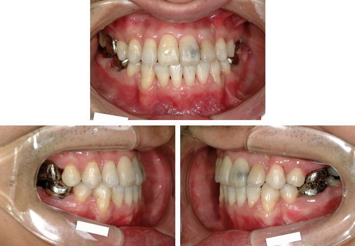 「治療内容」:上顎両側中切歯抜歯、上下顎マルチブラケット装置使用にて治療後、上顎両側側切歯形態修正
